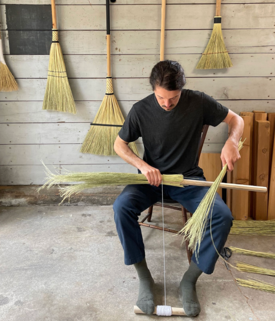 After lunch, with the handles shaped, we'll jump into the process of adding the sweeping head using the pre-soaked sorghum. We'll finish by learning how to stitch, clamp and flatten the fiber. During that process, Dan will share insights on technique, broom size, uses and more. From this workshop, you'll walk away with at least one completed broom, along with the ability to make more of them in the future.