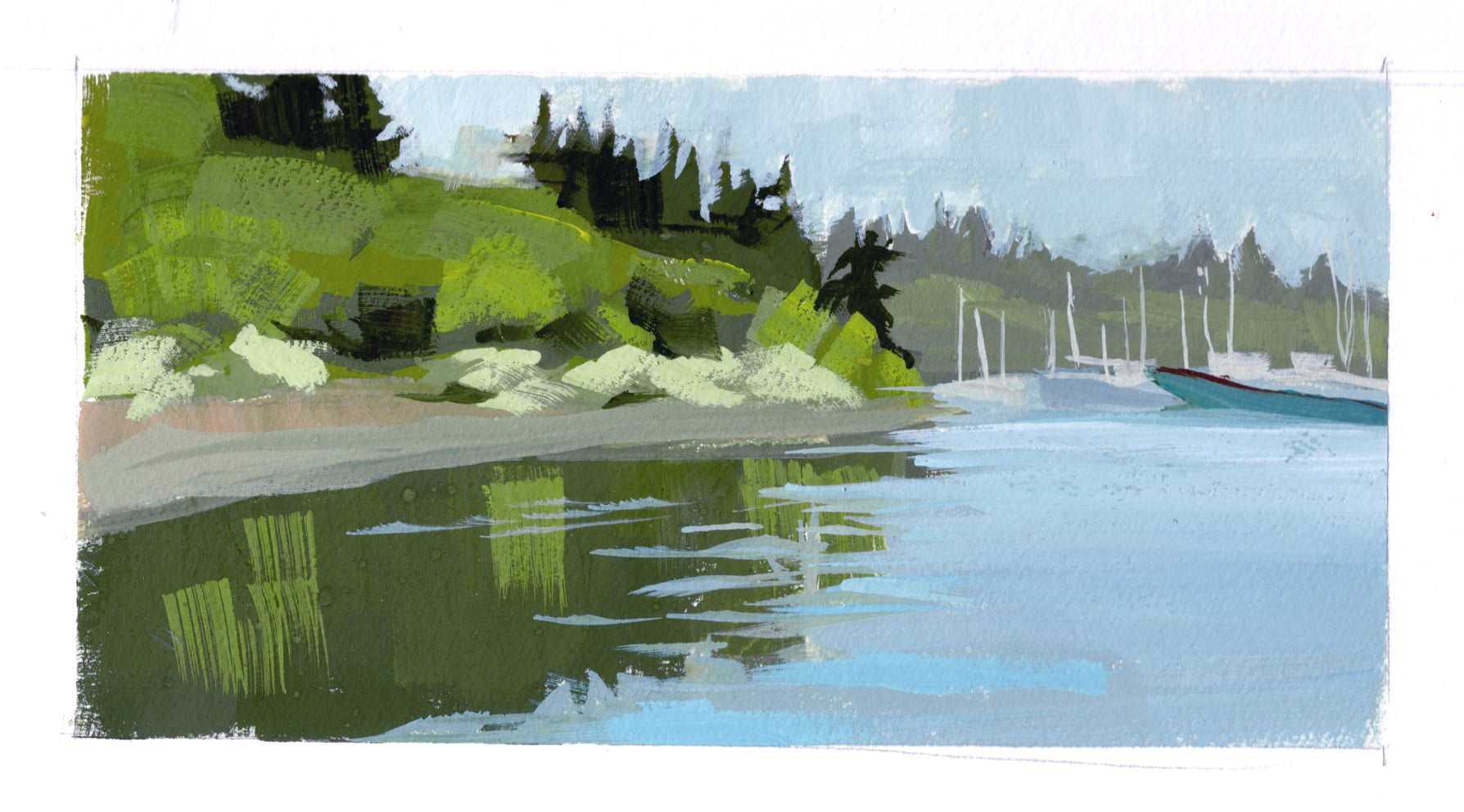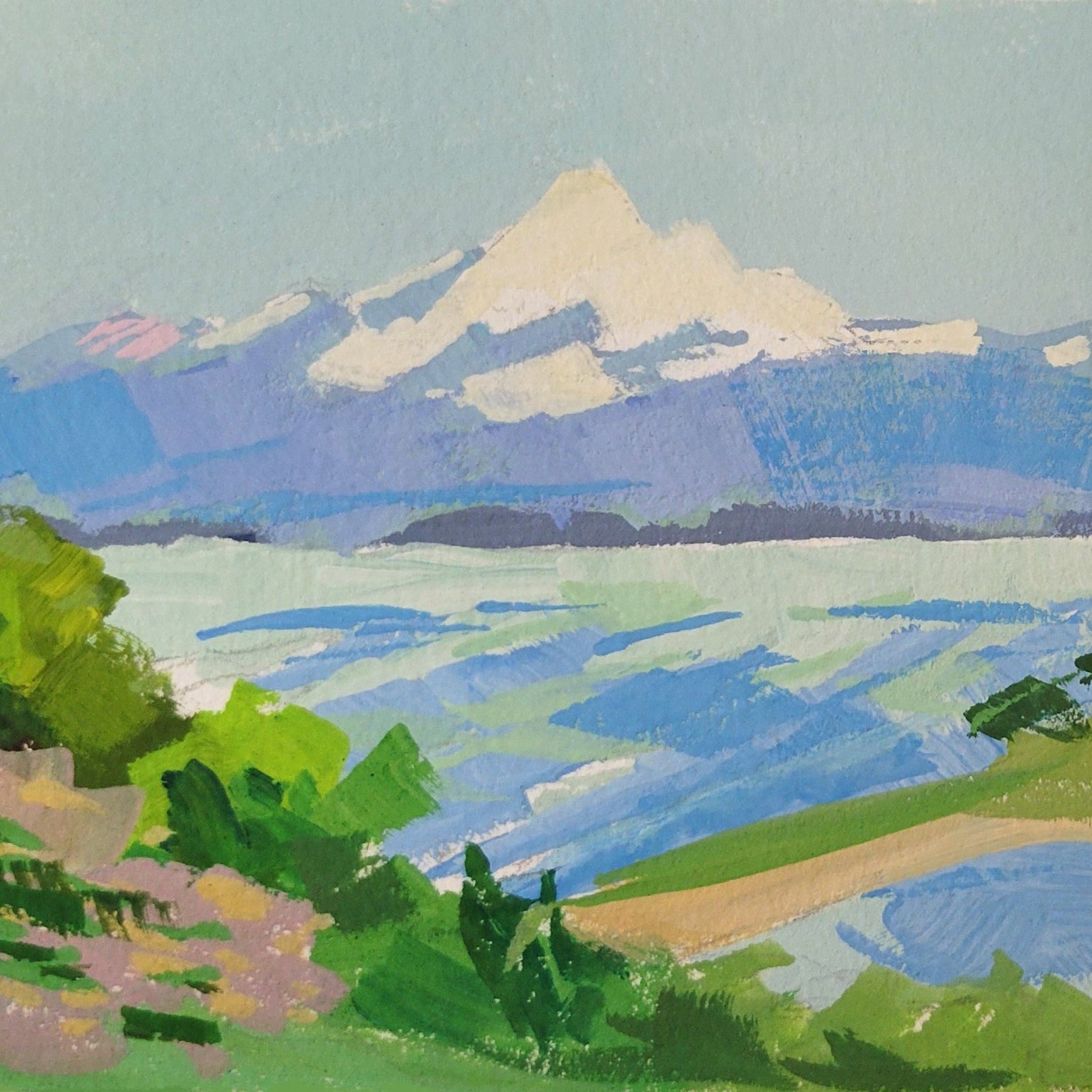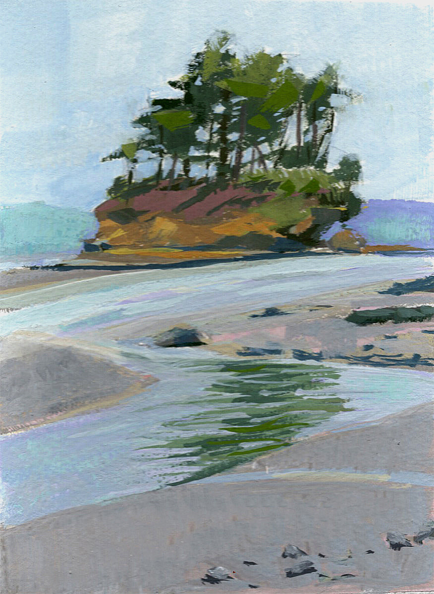 Gouache has several advantages for plein air painting. Your supplies are compact and lightweight and you could even paint in your lap in a pinch. You don't need solvents and can paint on paper, and you paint smaller and more quickly.